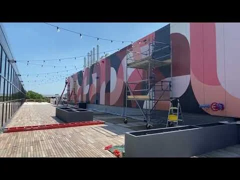 Scott and I flew to Boston in August of 2022 to paint a large outdoor mural in the old Boston Globe building. It was approximately 20 feet tall by 140 feet wide, and we used rollers and brushes to paint the shapes on the metallic surface. It took us 5 days to paint, 9 AM - 9 PM.